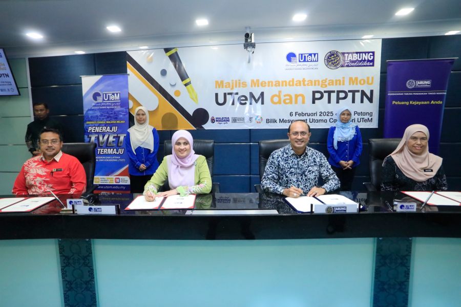 Universiti Teknikal Malaysia Melaka (UTeM) menjalin kerjasama strategik bersama Perbadanan Tabung Pendidikan Tinggi Nasional (PTPTN) menerusi pemeteraian Memoradum Persefahaman (MoU), di Kampus Induk UTeM, Durian Tunggal, baru-baru ini.