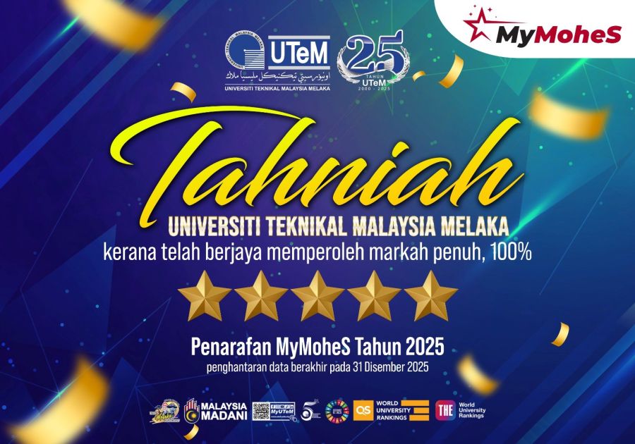 Universiti Teknikal Malaysia Melaka (UTeM) terus mempamerkan kecemerlangan berterusan yang mana pada kali ini UTeM telah mendapat pengiktirafan dengan pencapaian markah penuh 5 bintang dalam penarafan Sistem Pengumpulan Data Universiti Awam (MyMoheS) Tahun 2025, baru-baru ini.
