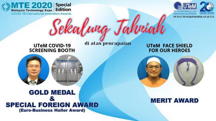 Kepakaran penyelidikan dan inovasi Universiti Teknikal Malaysia Melaka (UTeM) terus diperakui dunia apabila Reruai Saringan Covid 19 yang dibangunkan oleh penyelidik universiti ini telah memenangi pingat emas dan anugerah khas di Malaysia Technology Expo (MTE) 2020, baru-baru ini.