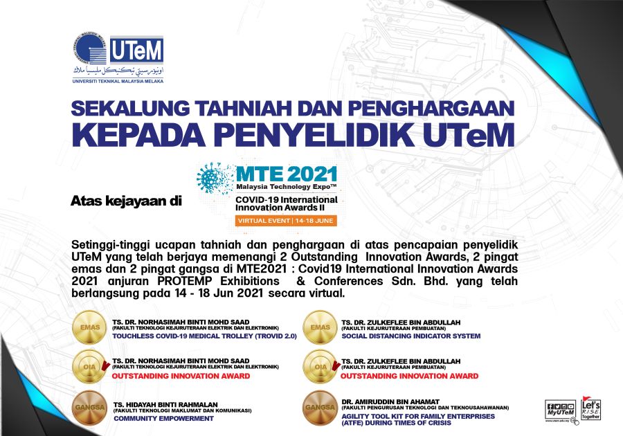 MTE 2021: Covid19 International Innovation Awards menyaksikan 2 produk inovasi UTeM menyerlah apabila dinobatkan sebagai penerima anugerah MTE 2021 Covid 19 Outstanding Award.
