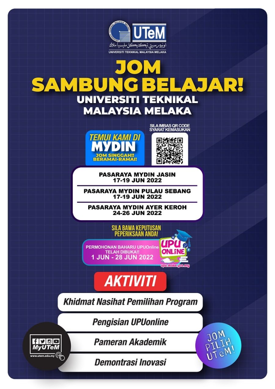 Program ini akan diadakan di Mydin Pulau Sebang dan Mydin Jasin pada 17 hingga 19 Jun 2022 manakala di Mydin MITC, Ayer Keroh pada 24 hingga 26 Jun 2022, justeru para pelajar dan ibu bapa bolehlah datang beramai-ramai mendapatkan khidmat nasihat bagi melanjutkan pengajian.