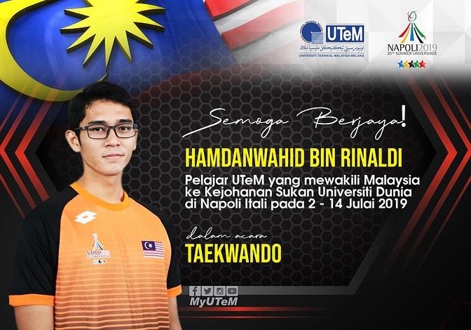 Dengan rekod kejayaan demi kejayaan melayakkan mahasiswa dari Universiti Teknikal Malaysia Melaka (UTeM) Hamdanwahid Rinaldi mewakili negara dalam acara taekwondo di peringkat dunia.